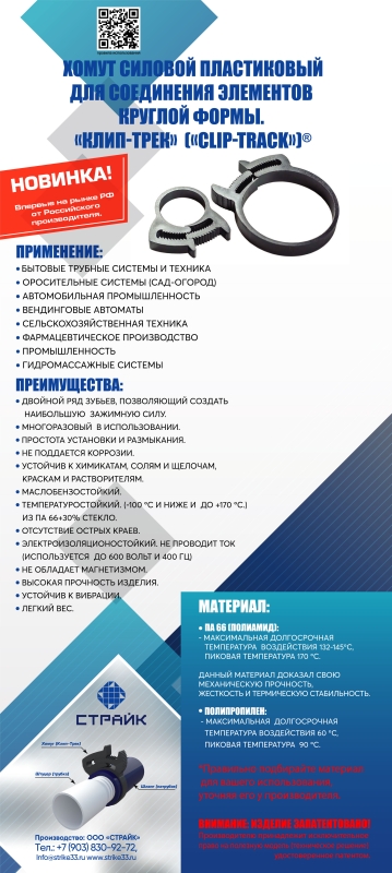 Благодаря данной конструкции, предоставляется возможность быстрой и простой установки хомута на элементы круглой формы: шланги, трубы, патрубки, штуцера. Конструктив запорного устройства «Клип-Трек» (Clip-Track)® обеспечивает прочность и надежность, обусловленную его уникальным двойным рядом зубьев в блокирующем замке.